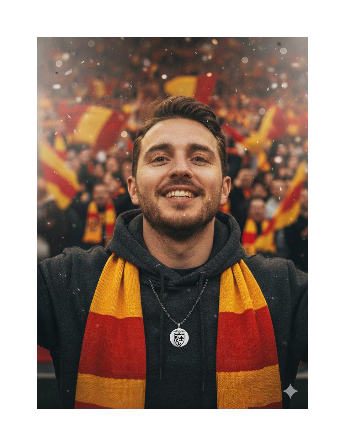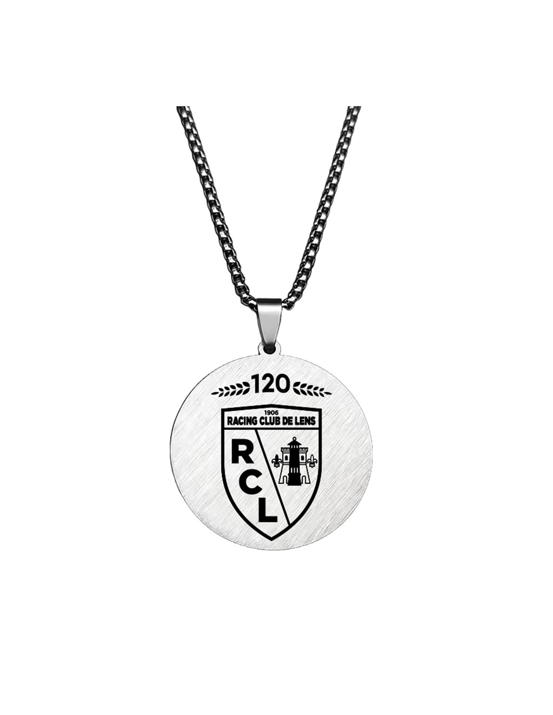 Portez fièrement les couleurs du Racing Club de Lens avec ce pendentif rond en édition spéciale anniversaire. Gravé du blason des 120 ans du club, il incarne toute l’histoire et la fierté lensoise, tout près du cœur.